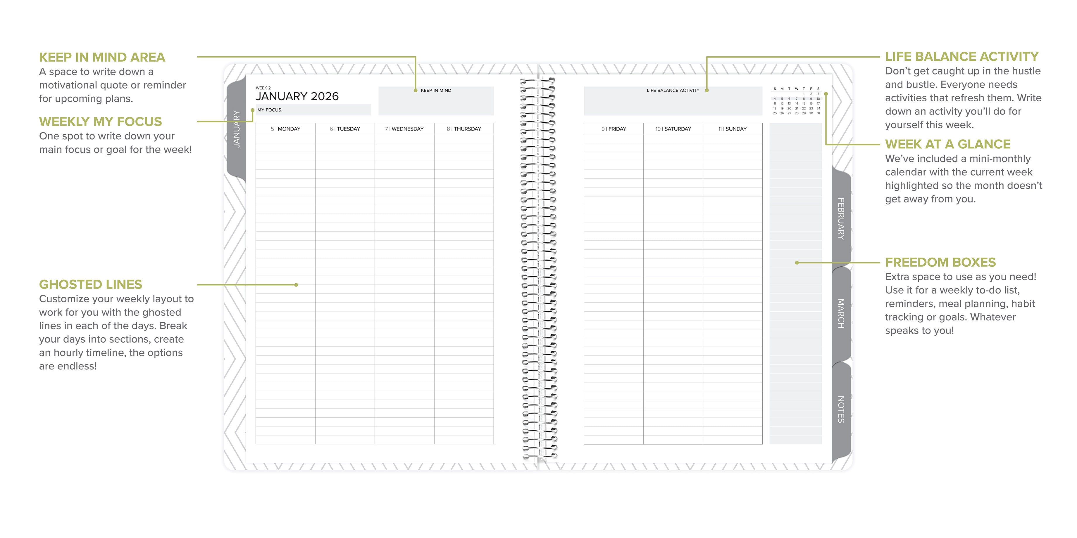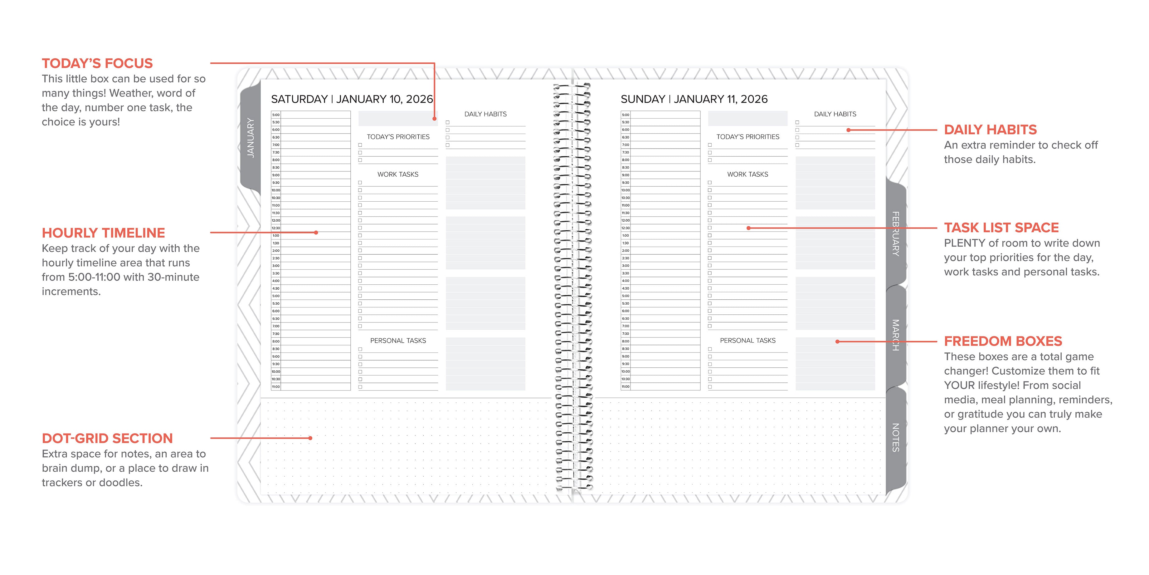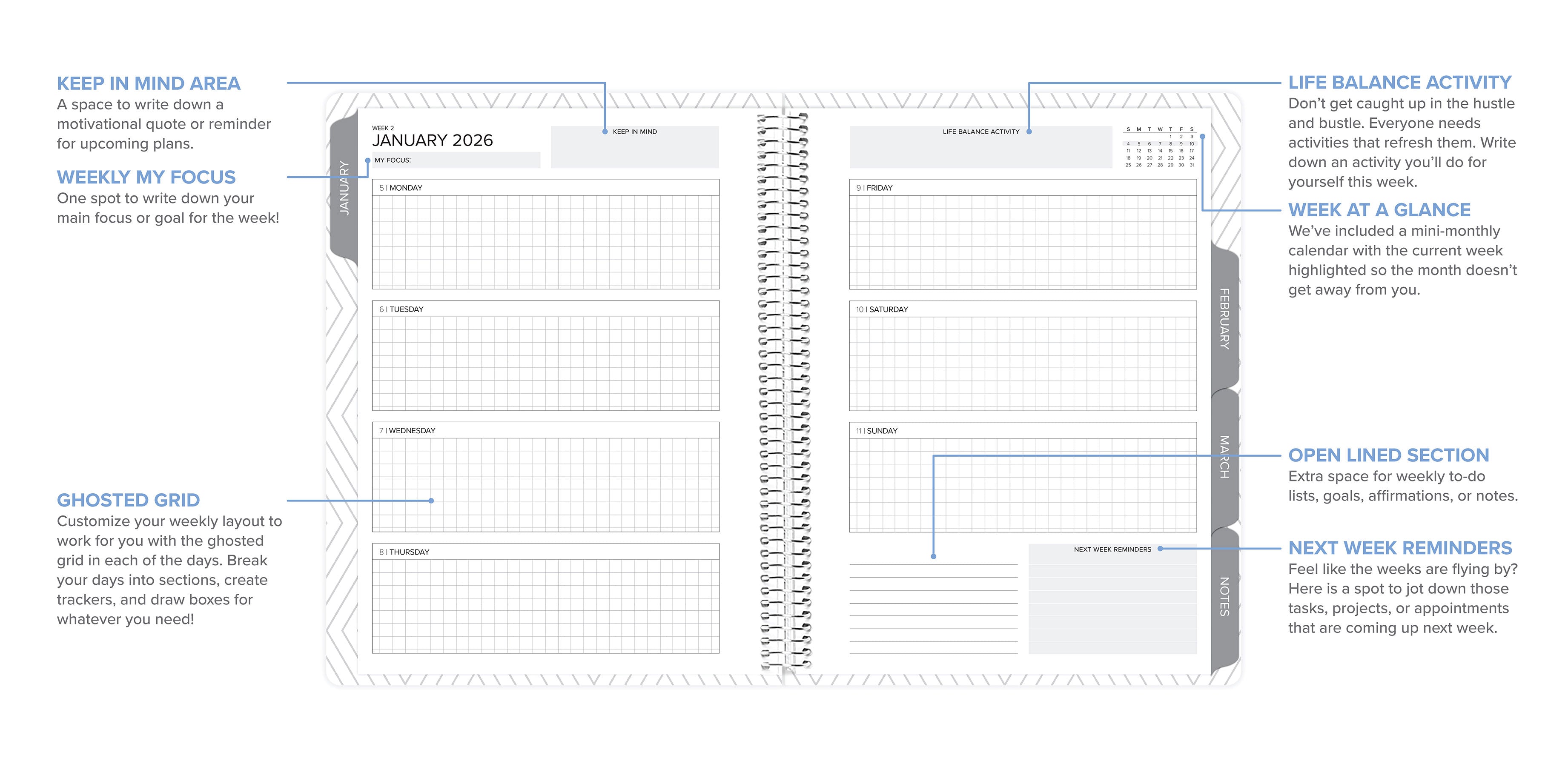This planner’s warm grey cover is more than just a neutral tone, it’s a reflection of balance, resilience, and strength. Inside, you’ll find a thoughtfully designed flow that makes planning feel approachable, not overwhelming. Each month begins with a spacious monthly layout and two dot-grid pages for notes, ideas, or reflections. From there, you’ll ease into your weekly overviews and daily spreads, giving you the structure you need with the flexibility you crave.